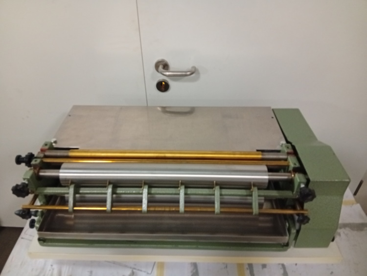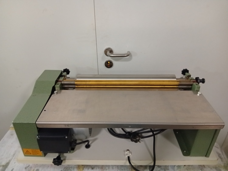 Anleimmaschine Sumbel Herold 500; sehr guter Zustand; Arbeitsbreite 500mm; Edelstahlwalzen; geeignet für Kaltleim; inkl.Zusatzleimwerk.