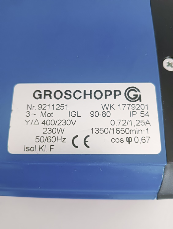 Groschopp Getriebemotor; Nr. WK1779201; 400/230V; 230W; 1350/1650min.; 0,72/125A; mit Getriebe Typ 11; 3000Mcm; 250 i; war in Technografica SPG verbaut; Zustand Gebraucht.